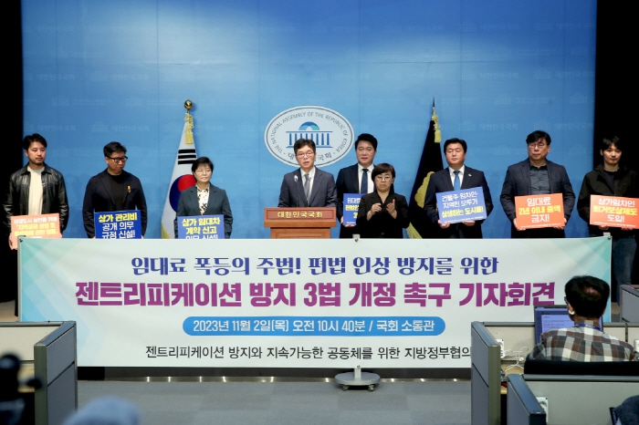지방정부와 관련 단체 등이 2일 국회 소통관에서 젠트리피케이션 방지 관련 3법 개정을 촉구하는 공동성명서를 발표했다. 정원오 성동구청장이 회장으로 있는 ‘젠트리피케이션 방지와 지속가능한 공동체를 위한 지방정부협의회’(이하 '지방정부협의회')가 임대료 폭등의 주범으로 꼽히는 편법 인상으로 인한 젠트리피케이션을 방지하고자 관련 법 개정을 촉구하는 기자회견을 개최한 것이다.