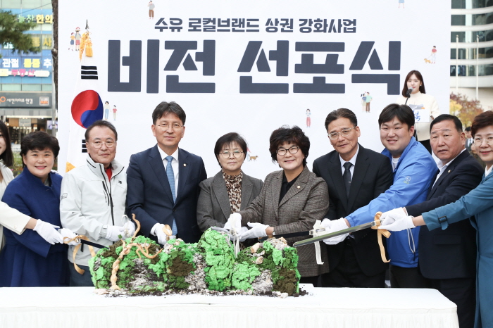 행사는 ‘사람과 문화가 흐른다. 수유 플로잉’을 비전으로 수유상권 로컬브랜드 사업소개, 비전선포식, 북한산 케이크 커팅식, 슬로건 ‘수유 in, 즐거움 on’ 제창 순으로 진행됐다.