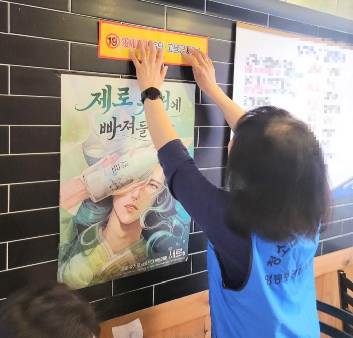 청소년 출입, 고용 금지 스티커를 부착하는 모습. 영등포구청 제공