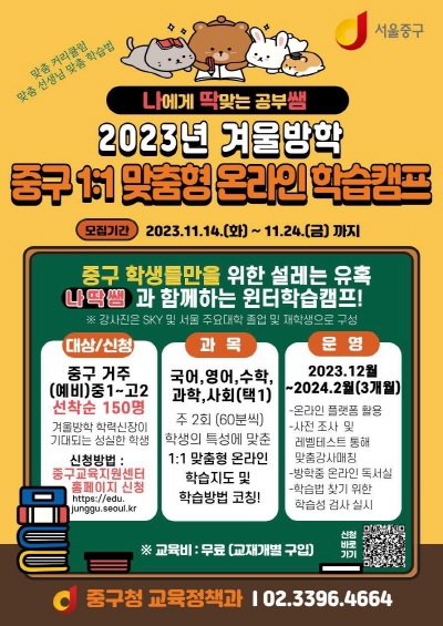 서울 중구가 예비 중학생 ~ 고2 학생을 대상으로 ‘2023년 겨울방학, 중구 1대1 맞춤형 온라인 학습캠프’를 운영한다. 사교육 인프라가 부족한 지역에 중구가 사교육에 버금가는 학습 기회를 제공하자는 취지다. 특히 온라인 과외와 온라인 독서실을 학습 프로그램에 결합하여 학원에 가지 않아도 공부 시간을 충분히 확보토록 했다.