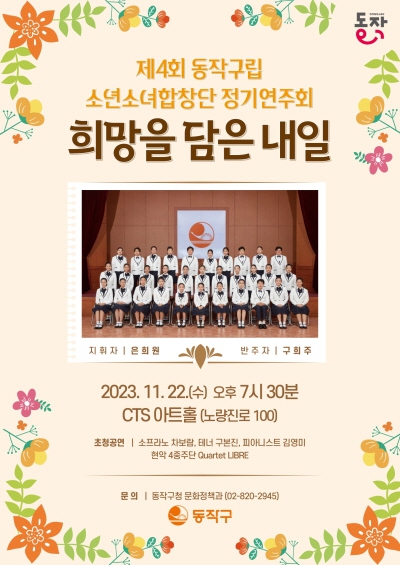 동작구가 오는 22일 오후 7시30분 CTS아트홀에서 동작구립 소년소녀합창단(이하 합창단) 정기연주회를 개최한다. 동작구립 소년소녀합창단은 관내 초‧중학생 32명, 지휘자, 반주자로 구성되어 지역행사 찬조공연, 정기연주회 등 다양한 행사를 진행하고 있다.