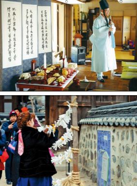 지난해 남산골한옥마을에서 열렸던 설맞이 행사. 민씨 가옥에서 열린 차례상 해설 모습과 시민들이 새해 소망을 적은 소원지를 달고 있는 모습이다. 서울시 제공