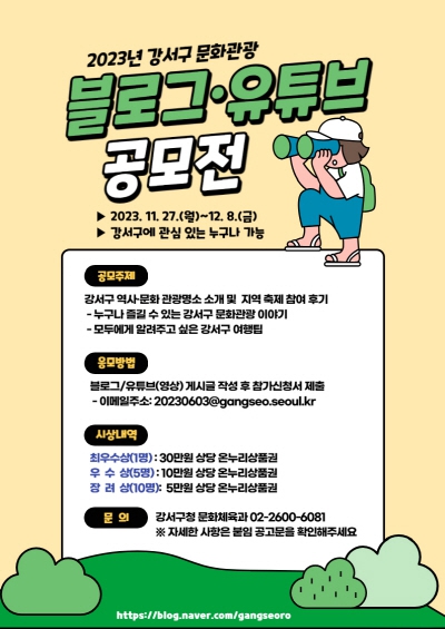 강서구가 ‘2023 강서구 문화관광 블로그·유튜브 공모전’을 개최한다. 이번 공모전은 주민들이 강서구의 역사, 문화, 관광명소 등을 직접 소개하는 참신한 콘텐츠 발굴을 통해 지역의 문화관광 자원을 널리 홍보하기 위해 마련됐다.