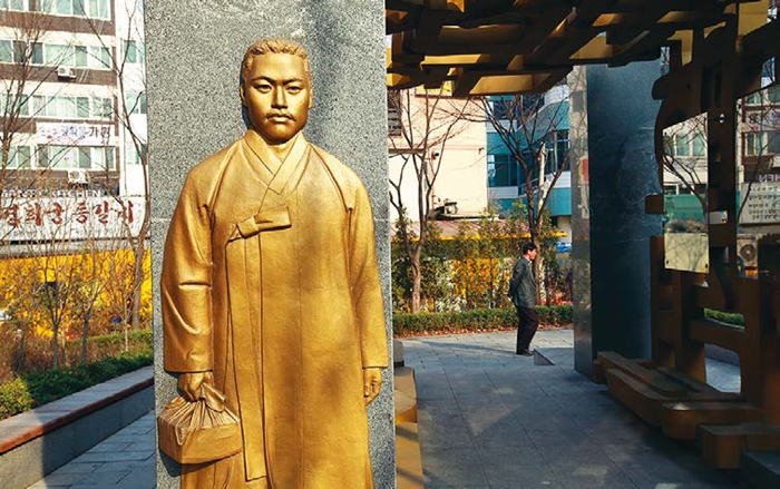 평생 곤궁하게 외길을 걸은 그는 39세 젊은 나이로 눈을 감았고, 집은 헐려 주상복합건물이 들어섰다. 새문안로에 있는 ‘용비어천가’ 건물이다. 안으로 들어서면 한글 조형물이 있어 선생의 집터였음을 일러준다. 그 건물 1층 커피 가게의 젊은이들은 당당하게 우리말을 터뜨리며 웃고 있었고, 바람을 타고 들어온 꽃향기가 은은하게 공간을 채웠다. 선생의 혼이 터에 남아 있다면, 이 장면을 흐뭇하게 바라보고 있지 않을까. 길은 다시 경복궁 담장을 따라 광장으로 뻗어나간다.