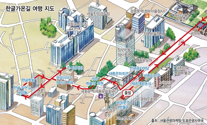 광화문 세종로 전역에 ‘한글가온길’이 있다. ‘가온’은 ‘가운데’를 뜻하는 순우리말이다. 여기 우리 고유문자인 ‘한글’의 흔적을 더하니 ‘한글이 중심된 길’이란 뜻이 되었다. 한글을 창제한 세종대왕과 한글을 지켜온 일제강점기의 조선어학회와 선조들, 그리고 주시경 선생의 이야기가 흐르는 약 2.5㎞의 길이다. 해를 넘겨가며 촛불을 들고 섰던 그 길은 이제 역사에 기록될 만큼 익숙한 길이지만 돌아서 걷다 보면 풍경은 새 모습으로 다가온다.