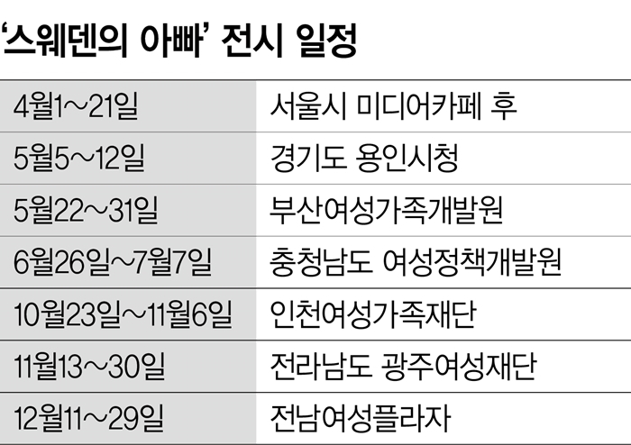 주한스웨덴대사관과 스웨덴 대외홍보처가 주최하는 이번 ‘스웨덴의 아빠’ 전시는 세계 순회전이다. 2016년 봄 미국을 시작으로, 독일, 우간다, 스위스, 중국을 거쳐 한국을 찾았다. 전시회 사진을 찍은 사진작가 요한 베브만(35)은 ‘스웨덴의 아빠’ 사진으로 세계보도사진전, POY 사진전, 소니 사진전, 미국언론사진가협회상, 유니세프사진전, 스웨덴통신사 TT 주관 최우수상을 받았고, 스웨덴 올해의 사진 등 크고 작은 사진 상을 휩쓸었다.