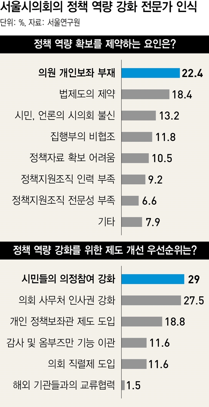 전문가들은 서울시의회 정책 역량 확보를 저해하는 요인 가운데 의원 개인보좌 부재(22.4%)가 가장 크게 영향을 미치는 것으로 꼽았다. 그 뒤를 이어 의회 인사권 등 법제도의 제약(18.4%), 시민과 언론의 시의회에 대한 불신(13.2%) 등의 순이었다.