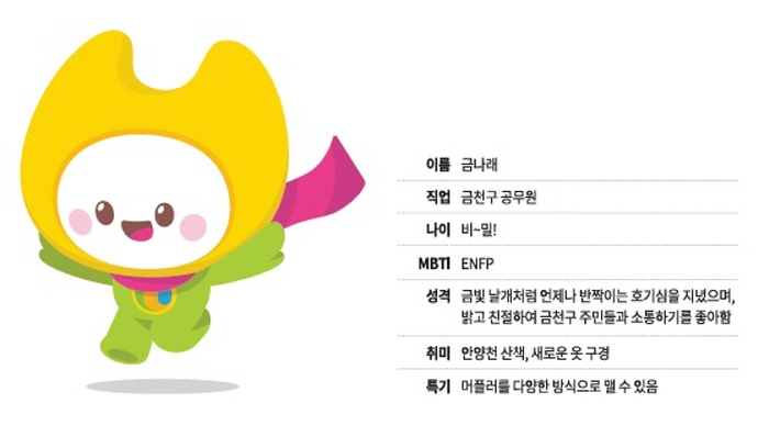 새로운 금나래 캐릭터 이미지는 금천구청 누리집에서 내려받아 사용할 수 있다. 다만 형태나 색상을 임의로 변경할 수 없으며, 2차 저작물을 제작하려면 구의 사전 허가가 필요하다.