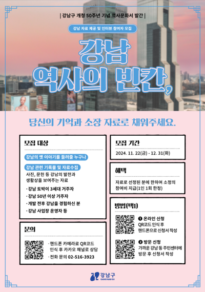 강남구(구청장 조성명)가 개청 50년(2025년 10월1일)을 맞아 강남의 역사와 문화를 집대성한 역사문화서를 제작한다. 이를 위해 강남 관련 기록물과 옛 이야기를 들려줄 주민 참가자를 12월 31일까지 모집하며 옛 자료 발굴에 나선다.