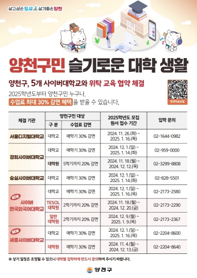 협약을 맺은 대학은 △서울디지털대학교 △경희사이버대학교 △숭실사이버대학교 △사이버한국외국어대학교 △세종사이버대학교로, 양천구민이라면 누구나 감면 혜택을 받을 수 있다.