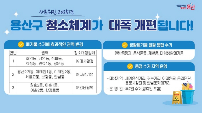 서울 용산구(구청장 박희영)가 주민 편의와 청소 효율성을 높이기 위해 청소체계를 대폭 개선했다. 쓰레기 미수거, 이면도로 청소 미흡 등의 불편을 해소하기 위한 조치다.