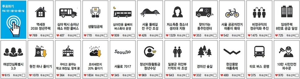 서울시의 온라인 집단지성 플랫폼 ‘데모크라시 서울’(democracyseoul.org)에선 지난달 11일부터 투표가 한창이다. 서울시가 지난 5년 동안 추진한 정책 가운데 혁신적이면서 전국으로 확산 가능한 것들을 국민들이 직접 골라 정부에 제안하기 위한 투표다. 후보군은 모두 21개로, 누구든 5개 정책을 추천할 수 있다. 투표는 오는 11일까지 진행된다.