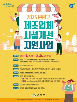 서울 은평구(구청장 김미경)가 제조업체의 작업환경 개선을 위해 ‘제조업체 시설개선 지원사업’ 참여업체를 모집한다. 접수 기간은 3월 4일부터 21일까지이며, 관내 제조업체 9곳을 선정해 최대 500만 원을 지원한다.