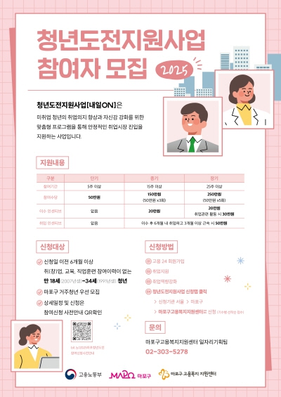 서울 마포구(구청장 박강수)는 구직활동에 어려움을 겪는 청년을 지원하기 위해 ‘청년도전 지원사업’ 참여자를 모집한다고 13일 밝혔다.