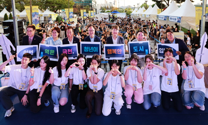 지난해 9월 금천구청 광장에서 진행된 금천청년축제에서 유성훈 구청장과 청년들이 기념사진을 찍고 있다. 금천구 제공