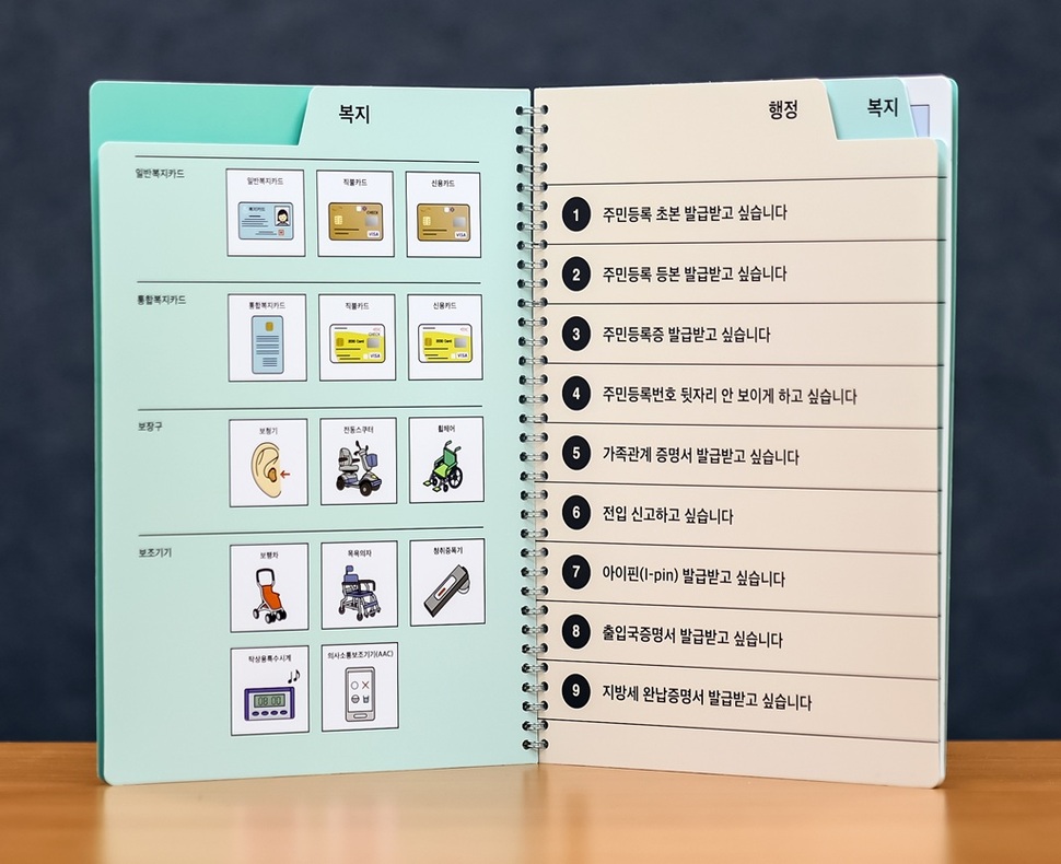 이번에 도입한 AAC 도구는 그림‧글자판 형태의 책자로, 구청 민원여권과를 비롯해 △16개 동주민센터 △보건소 △공공도서관 17개소 △지구대‧치안센터 13개소 등 민원인 방문이 많은 기관에 총 99권이 배부됐다.