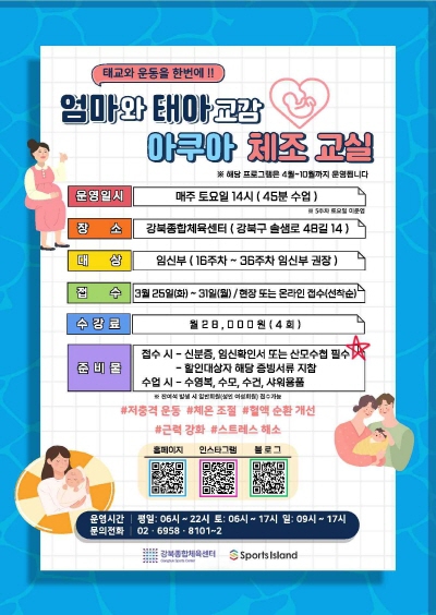 서울 강북구(구청장 이순희)가 미아동 강북종합체육센터에서 4월부터 10월까지 ‘엄마와 태아 교감, 아쿠아 체조 교실’을 운영한다.