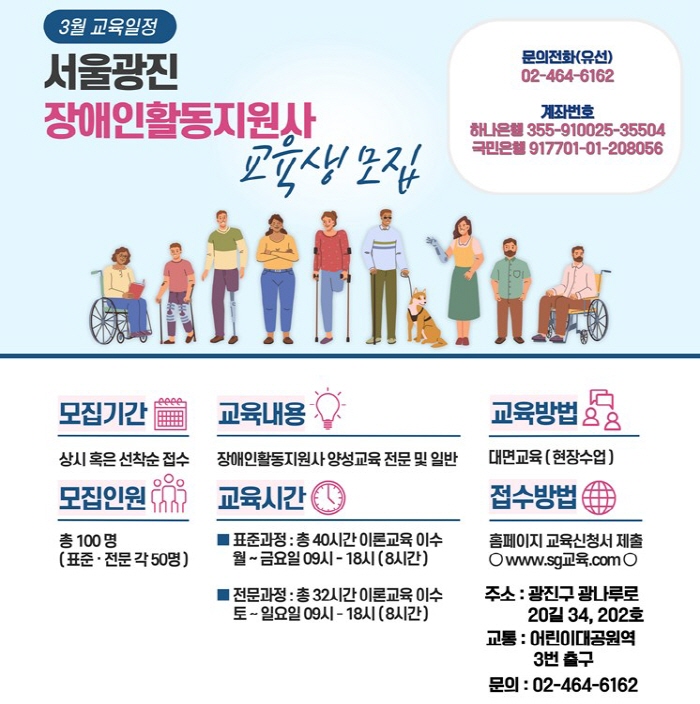 서울광진장애인활동지원사 교육기관은 광진구 광나루로20길 34, 202호에 위치하며 지하철 7호선 어린이대공원역에서 도보 7분 거리에 있다. 장애인활동지원사가 되기를 희망하는 구민은 전화(02-464-6162) 또는 서울광진장애인활동지원사 교육기관 누리집(www.sg교육.com)을 통해 신청하면 된다. 아울러 광진구는 장애인의 자립 생활 능력 향상과 지역사회 참여 확대를 위해 장애인활동지원 제공기관 8곳을 운영하고 있다. 장애인활동지원 서비스가 필요하면 누리집(www.ableservice.or.kr)에서 제공기관을 확인한 후 전화로 신청하면 된다. 김경호 광진구청장은 “장애인의 자립과 사회참여를 돕는 일은 우리 지역사회가 함께해야 하는 중요한 과제”라며 “이번 교육기관 지정을 계기로 전문적인 활동지원사를 양성해 더욱 질 높은 서비스를 제공할 수 있도록 최선을 다하겠다”고 말했다. 서울앤 취재팀 편집