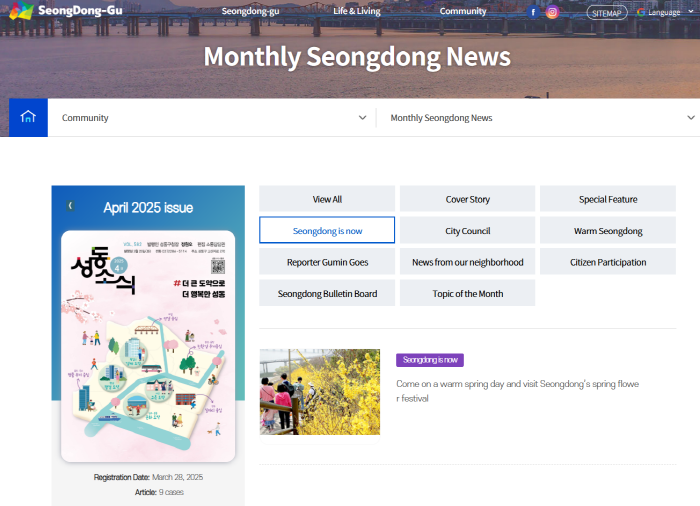 주요 개편 내용은 다국어 지원 확대, 성동구 소식지 메뉴 개편, ‘이달의 주요 소식’ 추가 구성 등으로 기능 및 디자인을 개선해 언어 경계를 허물고 사용자 편의를 높였다.
