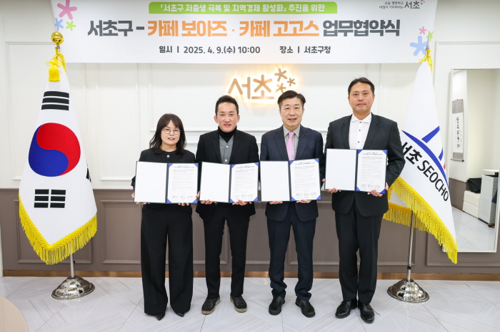 서울 서초구(구청장 전성수)는 9일 서초구청에서 지역 내 소상공인 업체인 카페 보아즈, 카페 고고스와 함께 ‘서초구 저출생 극복 및 지역경제 활성화’ 추진을 위한 업무협약(MOU)을 체결했다고 밝혔다.