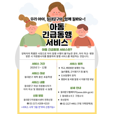 서울 동대문구(구청장 이필형)가 아동 양육 가정의 부담을 덜기 위해 올해도 ‘아동긴급동행서비스’를 운영한다.