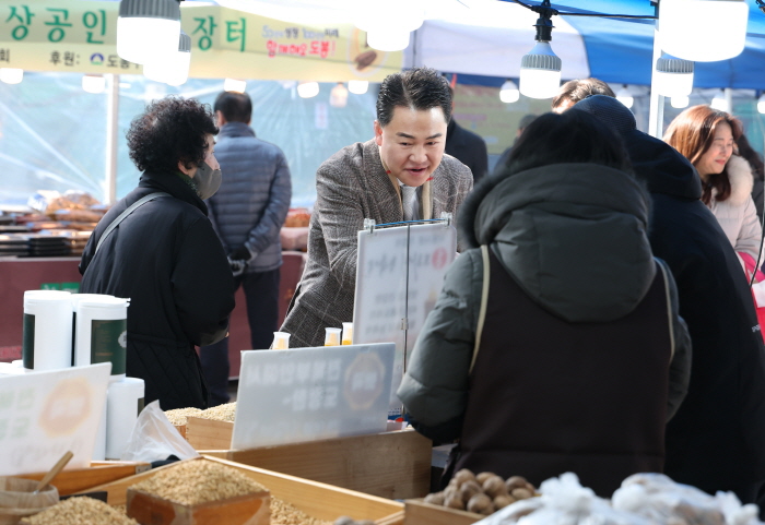 오언석 도봉구청장(가운데)이 지난 2월 창동역 하부에서 열린 소상공인 정월대보름 행복장터에서 물건을 구입하고 있다. 도봉구 제공