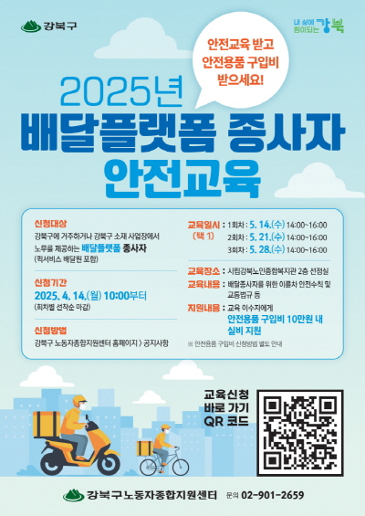 교육 대상은 강북구에 거주하거나 강북구 내 사업장에서 배달업무를 수행하는 배달플랫폼 종사자 및 퀵서비스 기사다. 접수는 4월14일부터 강북구 노동자종합지원센터 누리집에서 선착순으로 진행된다.