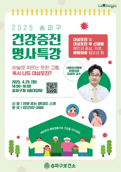 서울 송파구(구청장 서강석)는 29일 오후 2시 구청 대강당에서 ‘대상포진과 대상포진 후 신경통 건강강좌’를 개최한다고 밝혔다. 이번 강좌는 2025년 첫 번째 건강증진 명사특강이다.