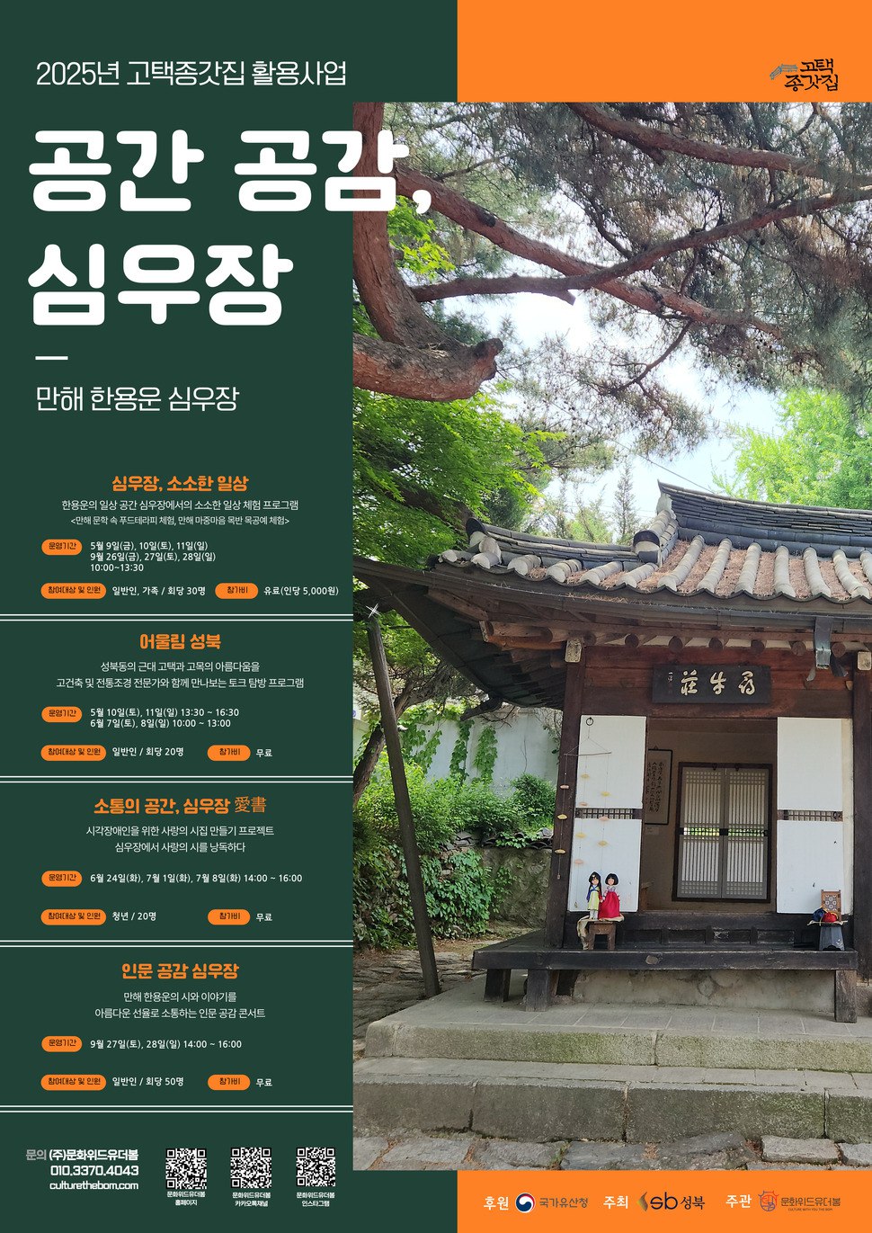 ‘어울림 성북’은 고건축과 전통조경 전문가와 함께하는 성북동 고택과 고목 탐방 프로그램으로, 탐방 후 리사이클링 체험도 제공한다. 5월10일, 5월11일, 6월7일, 6월8일에 누구나 참여할 수 있다. ‘소통의 공간, 심우장 애서’는 청년 대상의 시각장애인 사랑의 시집 만들기 프로젝트로, 한용운 시 낭독 녹음을 통해 오디오북을 제작하는 프로그램이다. 6월24일, 7월1일, 7월8일에 운영된다. ‘인문 공감, 심우장’은 만해 한용운의 시와 이야기를 음악으로 풀어내는 인문 콘서트로, 누구나 참여할 수 있다. 공연은 9월27일과 9월28일 진행된다. 이승로 성북구청장은 “심우장은 성북구의 주요 문화유산이자 역사 콘텐츠로, 가족과 성인 누구나 참여할 수 있는 프로그램을 준비했다”며 “이번 사업을 통해 고택의 역사와 문화를 체험하고 만해 한용운 선생의 독립정신과 문학사상을 느낄 수 있는 계기가 되길 바란다”고 말했다. 프로그램 참가신청 및 문의는 주관단체인 ㈜문화위드유더봄의 누리집과 블로그, 카카오채널, SNS 등에서 확인할 수 있다. 서울앤 취재팀 편집