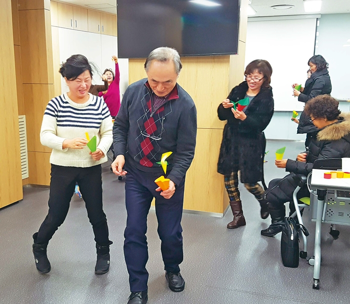 서초구의 손주돌보미로 등록한 할아버지 할머니들이 사전 육아교육 시간에 종이접기 놀이를 실습하며 즐거워하고 있다. 서초구 제공