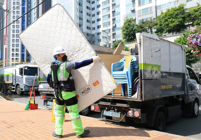 도봉구 환경공무관이 ‘입는 로봇’을 입고 침대 매트리스를 차에 옮기고 있다. 도봉구 제공