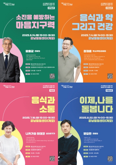 7월4일에는 한국, 미국, 캐나다 약사 자격을 가진 정재훈 약사가 ‘운동습관’을 주제로 음식과 건강관리에 대한 실용적인 정보를 강연한다. 7월18일에는 연희동 요리 교실을 운영하는 요리연구가 나카가와 히데코가 ‘식습관’을 주제로 강연을 펼치며, 8월22일에는 정신건강의학과 전문의 문요한 원장이 ‘마음습관’을 주제로 ‘자기 돌봄의 심리학’을 통해 건강한 자아와 내면 성장에 대한 이야기를 전할 예정이다. 6월 강연은 5월26일부터 강남구 통합예약사이트에서 신청 가능하며, 이후 강연은 각 강연일 10일 전부터 강남힐링센터 홈페이지에서 접수할 수 있다. 강남힐링센터 카카오톡 채널 가입 시 특강 및 프로그램 안내를 받아볼 수 있다. 조성명 구청장은 “강남힐링센터는 구민이 몸과 마음의 균형을 되찾고 삶에 여유를 더할 수 있는 공간”이라며 “전문가들의 심도 있는 강연이 좋은 습관 형성과 지속가능한 행복으로 이어지길 바란다”고 말했다. 서울앤 취재팀 편집