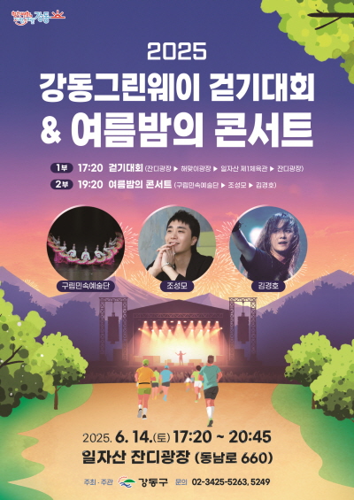 서울 강동구(구청장 이수희)는 오는 6월 14일 오후 5시 20분부터 일자산 잔디광장에서 ‘제98회 강동그린웨이 걷기대회’와 ‘2025년 여름밤의 콘서트’를 연계 개최한다.
