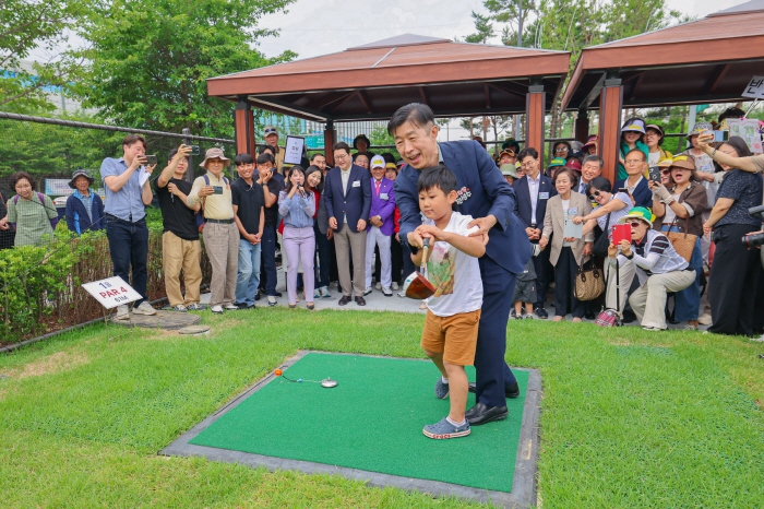 전성수 서초구청장이 청계산 수변공원 파크골프장에서 어린이와 함께 파크골프를 즐기고 있다. 서초구 제공