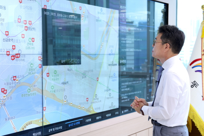스마트정책소통방을 통해 재난‧침수 위험지역을 살피고 있는 정원오 구청장. 성동구 제공