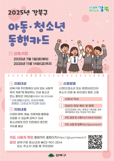 서울 강북구(구청장 이순희)는 아동·청소년의 문화, 예술, 진로 체험을 돕기 위해 ‘아동·청소년 동행카드 지원 사업’을 추진한다고 밝혔다.