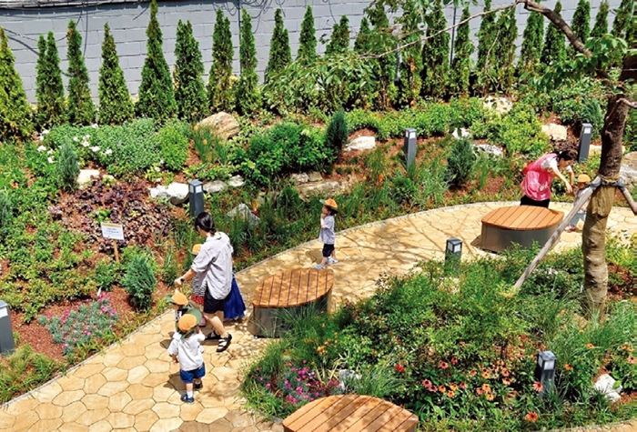 ‘에메랄드그린’ 수목으로 둘러싸인 아늑한 공간에는 벤치와 볼라드 조명이 곳곳에 설치돼 언제든 와서 편안히 머무를 수 있도록 했다. 왕벚나무를 비롯한 18종의 수목 1079주와 금계국 등 25종의 초화 2264본이 식재돼 계절마다 다채로운 색으로 물드는 정원을 감상할 수 있다.