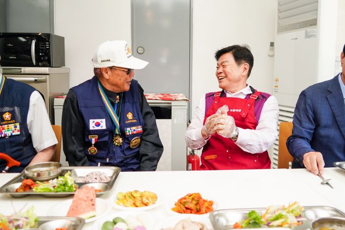 지난달 동대문구 보훈회관에서 열린 ‘보훈나눔행사’에 참석해 유공자들과 담소 나누는 이필형 동대문구청장(사진 오른쪽). 동대문구 제공