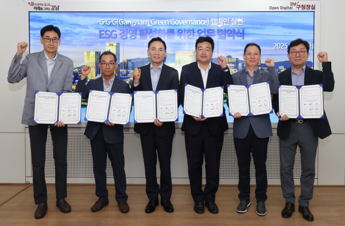 서울 강남구(구청장 조성명)는 7월8일 구청에서 관내 대형 건축공사장의 시공사 5곳과 ‘G.G.G. 실천 캠페인 및 ESG 경영 활성화를 위한 공동 협약’을 체결했다고 밝혔다. 협약에는 삼성물산, CJ대한통운, GS건설, 현대건설, 효성중공업이 참여했다.