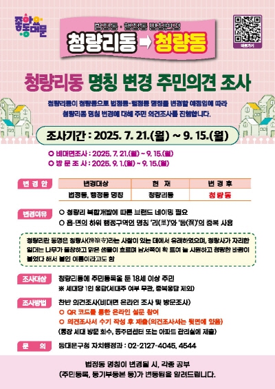 이번 조사는 청량리 복합개발로 인해 변화된 지역 현실을 반영하고 보다 간결하고 상징성 있는 명칭으로 바꾸자는 주민 요청에 따라 추진됐다.