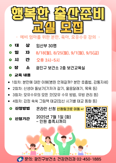 교육은 8월 18일부터 광진구 보건교육실에서 총 4회 진행되며, 회차별 주제는 △분만 이해 △신생아 돌보기 △모유수유 △감정 쑥쑥 그림책 태교다. 참여 신청은 7월21일부터 구글폼 또는 QR코드를 통해 선착순 30명을 모집한다.