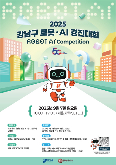 서울 강남구(구청장 조성명)는 9월7일 서울 SETEC 제1·2전시장에서 ‘2025 강남구 로봇·AI 경진대회’를 개최한다. 이번 대회는 주민과 함께하는 로봇 체험축제로 꾸며지며 참가자 모집은 8월1일부터 시작된다.