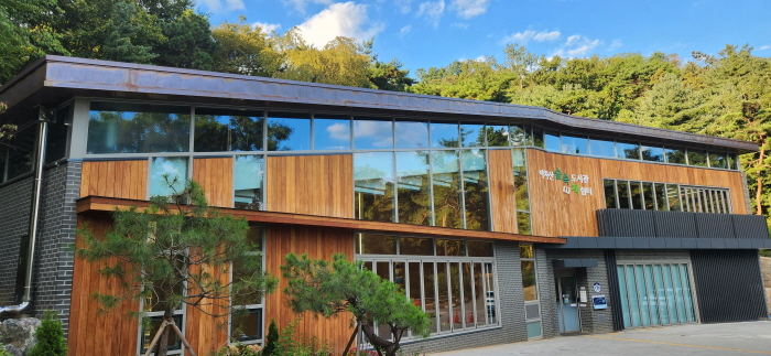 울창한 숲속에 자리잡은 도서관은 높고 탁 트인 층고, 중앙 독서테이블, 통유리창으로 보이는 숲 풍경 등이 조화를 이루며 방문객에게 깊은 몰입과 여유를 제공하고 있다.