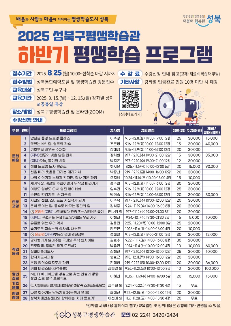 서울 성북구(구청장 이승로)는 8월25일부터 ‘2025 하반기 평생학습 프로그램’ 수강생을 모집한다. 이번 프로그램은 다양한 학습 기회를 통해 관심 분야를 탐색하고 자기 역량을 확장해 제2의 인생 재도약을 준비할 수 있도록 기획됐다.