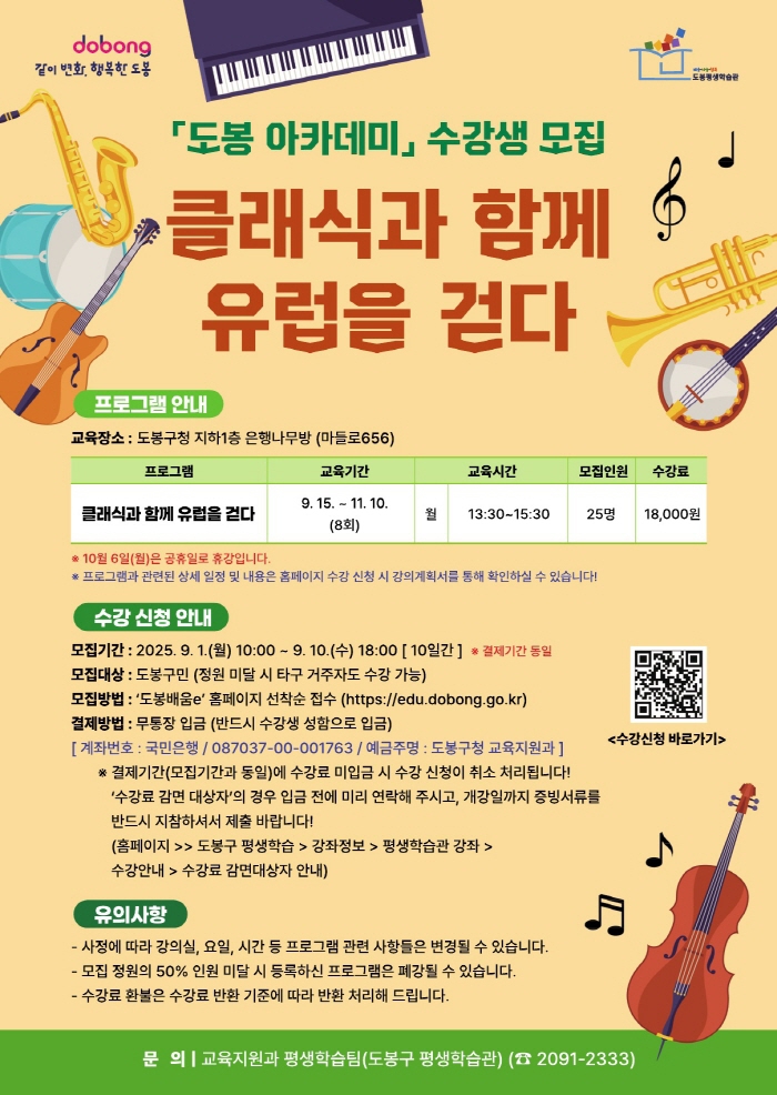 서울 도봉구(구청장 오언석)가 9월1일부터 10일까지 유럽의 음악과 문화를 배울 수 있는 ‘클래식과 함께 유럽을 걷다’ 강좌 참여자를 모집한다.