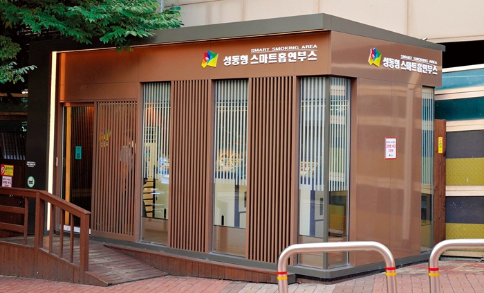 성동구가 지자체 최초로 도입한 밀폐형 흡연 부스로 간접흡연으로 고통받는 비흡연자의 불편을 해소하면서 흡연자도 안전하게 흡연할 수 있는 권리를 존중하는 공공갈등 해소형 스마트 시설이다. 밀폐형 음압설비를 갖춰 문이 열려도 담배 연기가 바깥으로 새어 나오지 않는 것은 물론, 공기 정화 장치로 내부 공기를 지속 순환시킨다. 부스 내부는 냉난방 시스템이 내장돼 사계절 쾌적한 환경을 제공하며, 니코틴이나 타르가 붙지 않도록 특수 코팅 처리돼 있다. 담배꽁초를 자동 소화하고 파쇄하는 기능을 갖춘 ‘스마트 재떨이’가 설치돼 쌓인 담뱃재와 꽁초는 독성을 제거한 뒤 열가소성 목재로 가공해 친환경 목제 제품으로 재활용할 수 있도록 처리된다. 설치 뒤 흡연 다발 지역 민원이 수백 건에서 0건으로 획기적으로 줄었다.