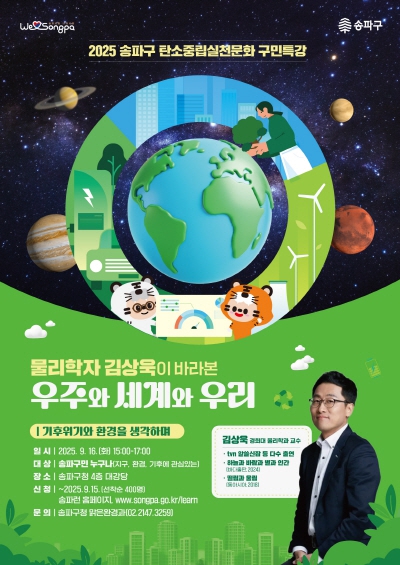 서울 송파구(구청장 서강석)는 9월16일 오후 3시 구청 대강당에서 경희대 물리학과 김상욱 교수를 초청해 ‘2025 탄소중립 실천문화 구민특강’을 연다고 밝혔다.