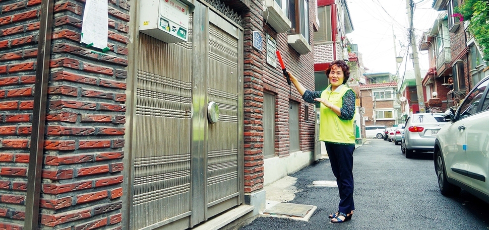 강동구 마미순찰대 이경애 대원이 지난 6월29일 성내2동의 한 주택가 골목에 들어선 뒤 골목의 안전을 꼼꼼히 점검하고 있다. 강동구 제공
