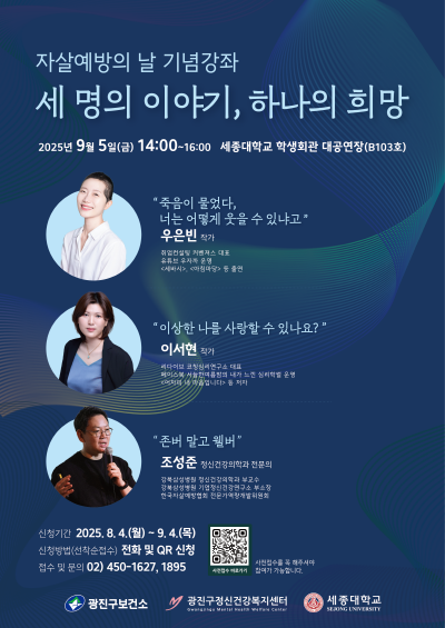 이번 행사는 자살예방의 날을 맞아 생명존중의 중요성을 알리고 자살예방에 대한 관심을 높이기 위해 마련됐다. 강좌는 오후 2시부터 2시간 동안 진행되며 ‘세 명의 이야기, 하나의 희망’을 주제로 세 명의 강사가 차례로 강연을 이어간다. 우은빈 유튜브 크리에이터, 이서현 일러스트 작가, 조성준 정신건강의학과 전문의가 각자의 삶 속에서 느낀 생명의 소중함과 희망의 메시지를 전달한다.