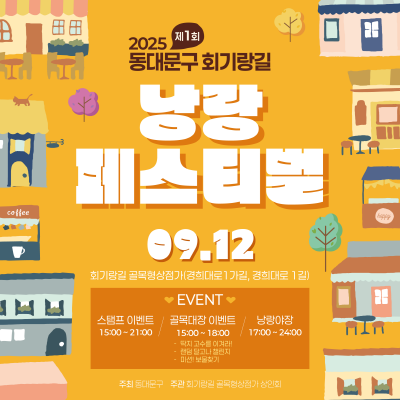 서울 동대문구(구청장 이필형)는 9월12일 회기랑길 골목형상점가(경희대로1가길, 경희대로1길)에서 ‘낭랑 페스티벌’을, 13일 장안마실상점가(답십리로66길 일대)에서 ‘생맥주 밤마실’을 연다고 밝혔다.